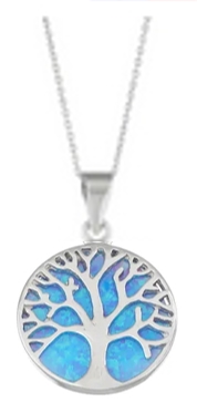 Small Tree Pendant with a (lab-created) Blue Opal background - with a lighter 24" sterling silver chain.